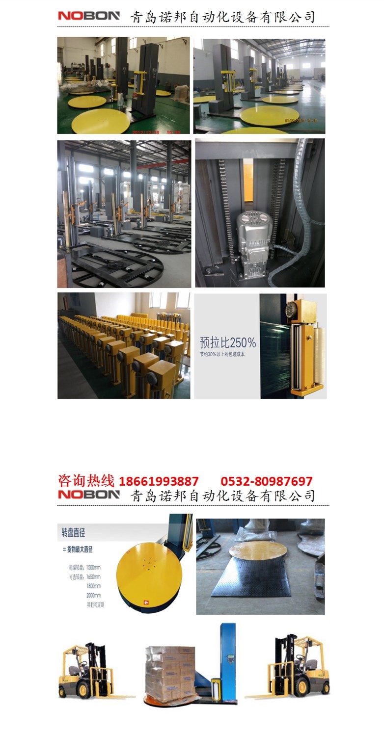 纏繞機(jī)智能型利用耐磨膠輥的差速比,將PE纏繞膜充分拉開后,均勻的纏包到轉(zhuǎn)動(dòng)的托盤貨物上。智能型纏繞機(jī)包裝過程及包裝量等相應(yīng)參數(shù)可自由設(shè)定,由各部分傳感器采集并返回?cái)?shù)據(jù)后,匯總到中央處理器(即PLC),由PLC對(duì)收到的數(shù)據(jù)處理后,協(xié)調(diào)、控制設(shè)備做出相應(yīng)的動(dòng)作。包裝全過程描述:設(shè)定好包裝層數(shù)、加固圈數(shù),貨物放到轉(zhuǎn)盤上,機(jī)器夾臂自動(dòng)夾住膜頭,遙控啟動(dòng),機(jī)器開始轉(zhuǎn)動(dòng),機(jī)器轉(zhuǎn)動(dòng)到一圈后夾臂打開,智能型纏繞機(jī)按照既定參數(shù)運(yùn)行完畢后,夾臂夾住膜,并斷膜,下貨,等待下托貨物包裝。