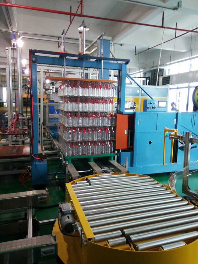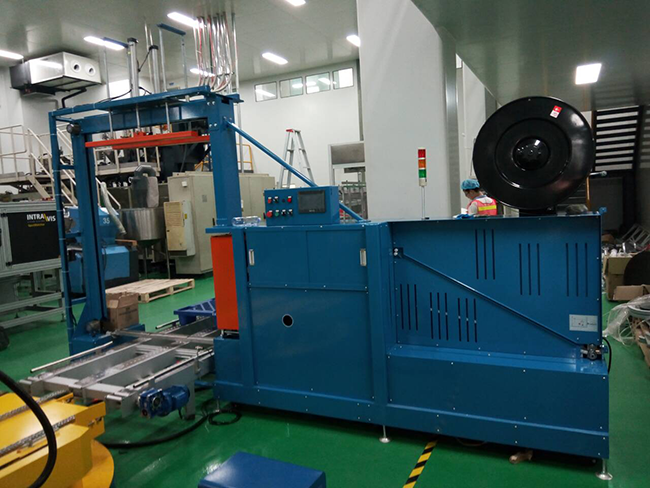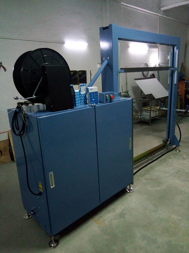 開(kāi)放式弓架活動(dòng)的穿帶能將棧板與捆包物牢固地捆包在一起便于移動(dòng)及運(yùn)輸,堆滿產(chǎn)品的棧板通過(guò)輸送滾筒線可實(shí)現(xiàn)無(wú)人化捆包生產(chǎn)線。