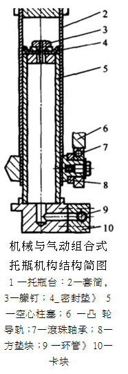該圖示出了機械和氣動瓶保持機構(gòu)的示意圖。裝備有瓶子保持器1的套筒2可以沿著中空柱塞5滑動,并且方形塊8用作防止套筒升高或降低時撓曲的導(dǎo)向件。當(dāng)提起瓶子時,壓縮空氣從柱塞的下部通過釘子3上的中心孔進入套筒,以促進瓶子的運動。它的速度由凸輪導(dǎo)向器6和導(dǎo)流軸承7控制,直到工作臺轉(zhuǎn)到瓶子放置區(qū)域。然后,套筒和瓶子固定器1在凸輪的強制作用下被完全按下。同時,柱塞內(nèi)部的壓縮空氣仍被排放到連接到每個瓶筒氣路的環(huán)形管中,然后進入另一個將要上升的瓶筒。