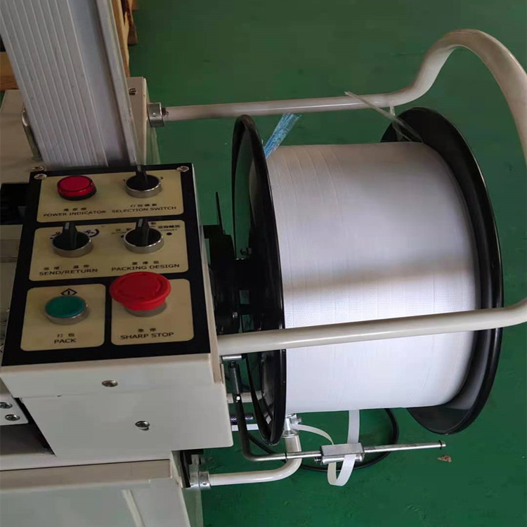 6、拿著打包帶的頭就從底部裝線,再到上面,打包帶的頭推進(jìn)打包機(jī)的入口處